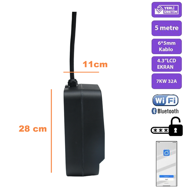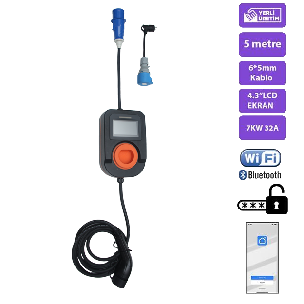 LED ekran / durum ışıkları ile şarj bilgisi Şarj esnasında amper değiştirme özelliği (Cihaz ve uygulama üzerinden) |